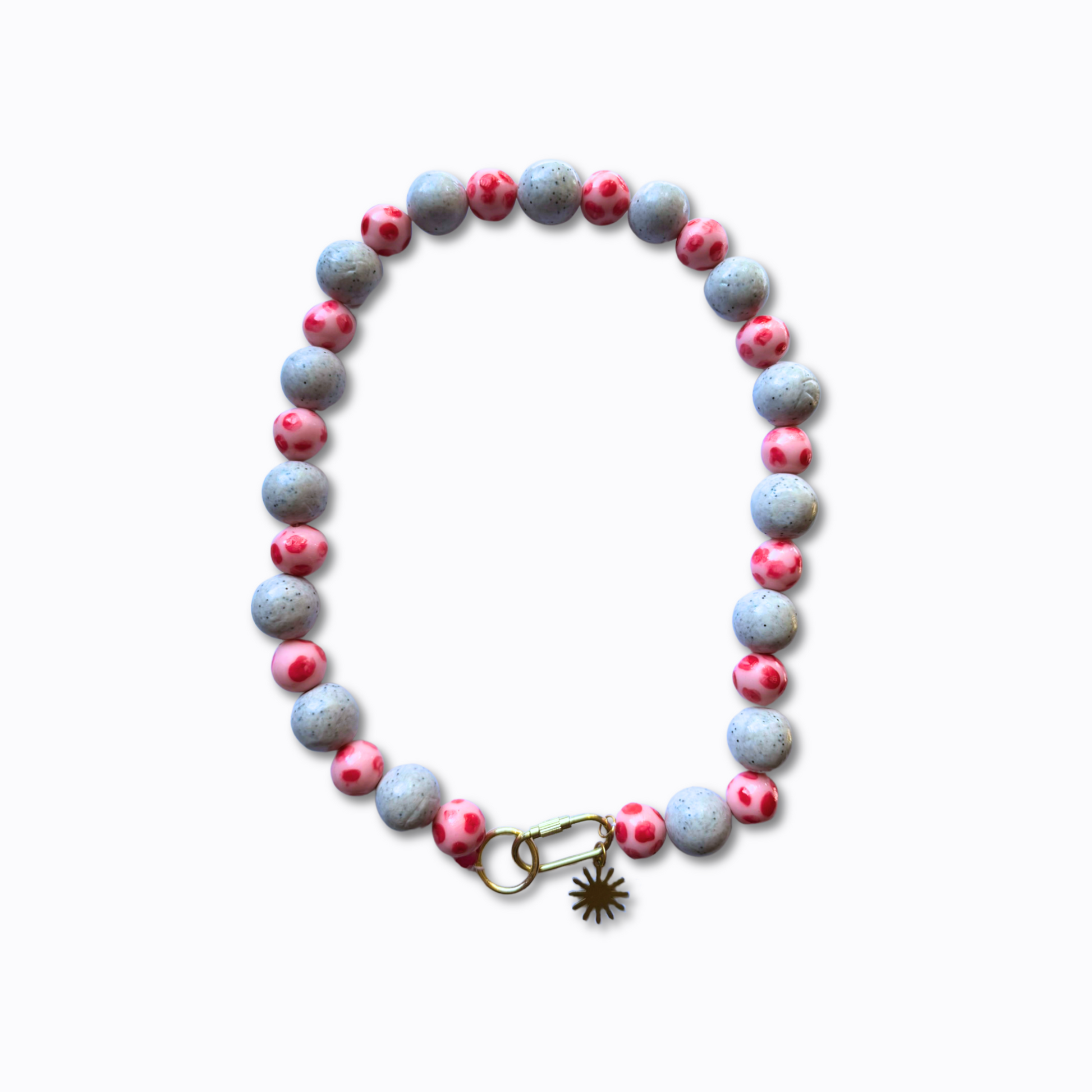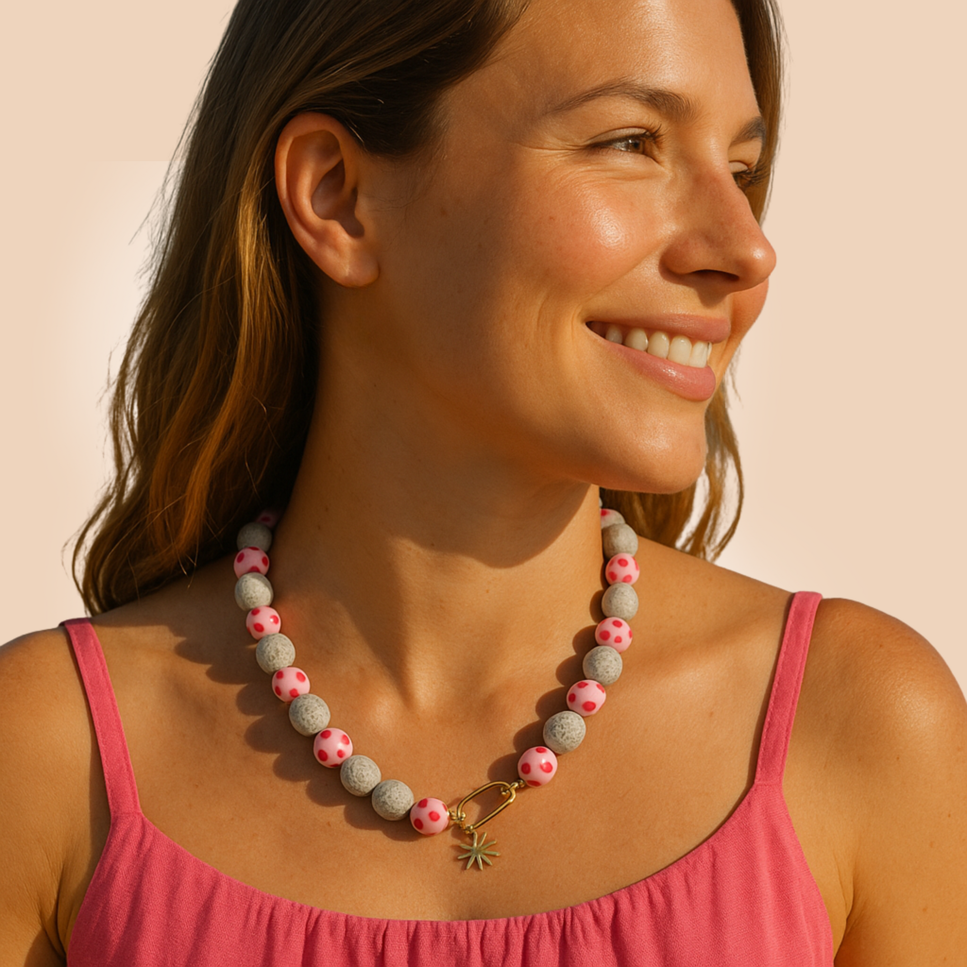 Confeccionado en cuentas de arcilla polimérica hechas y pintadas a mano, adornado con un lindo sol de bronce y cierre de acero quirúrgico.