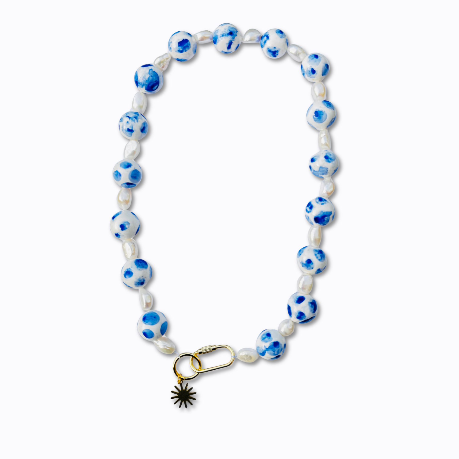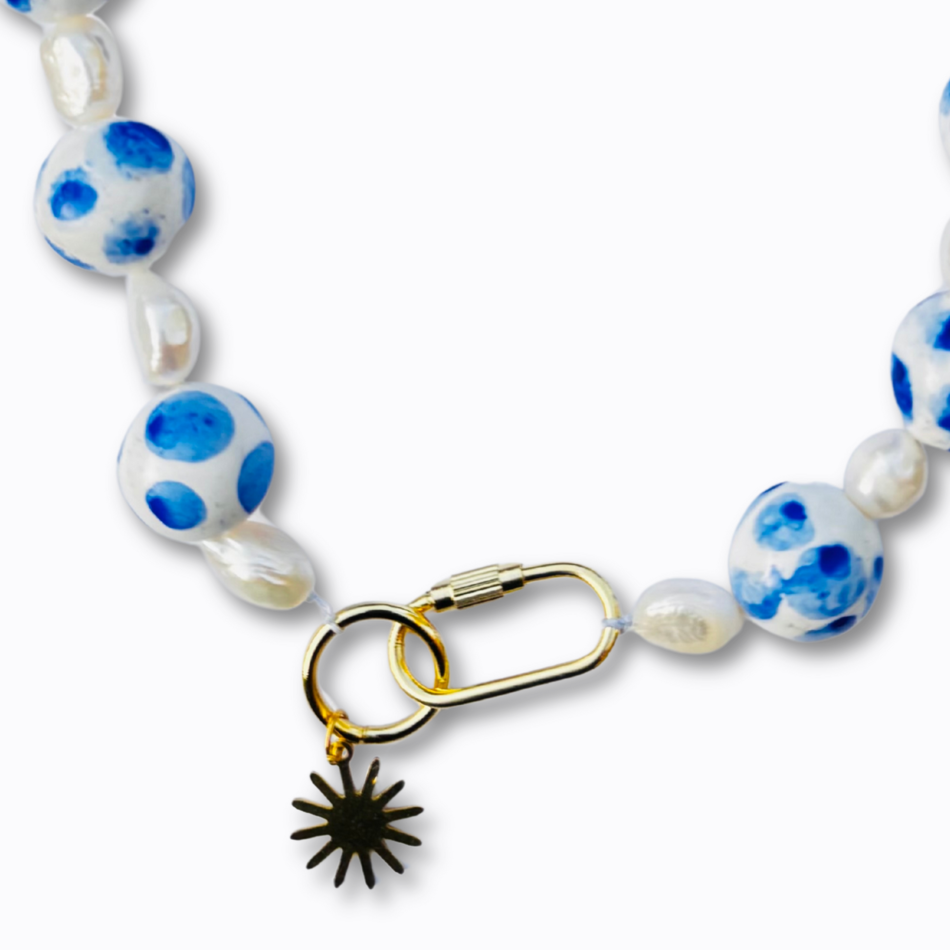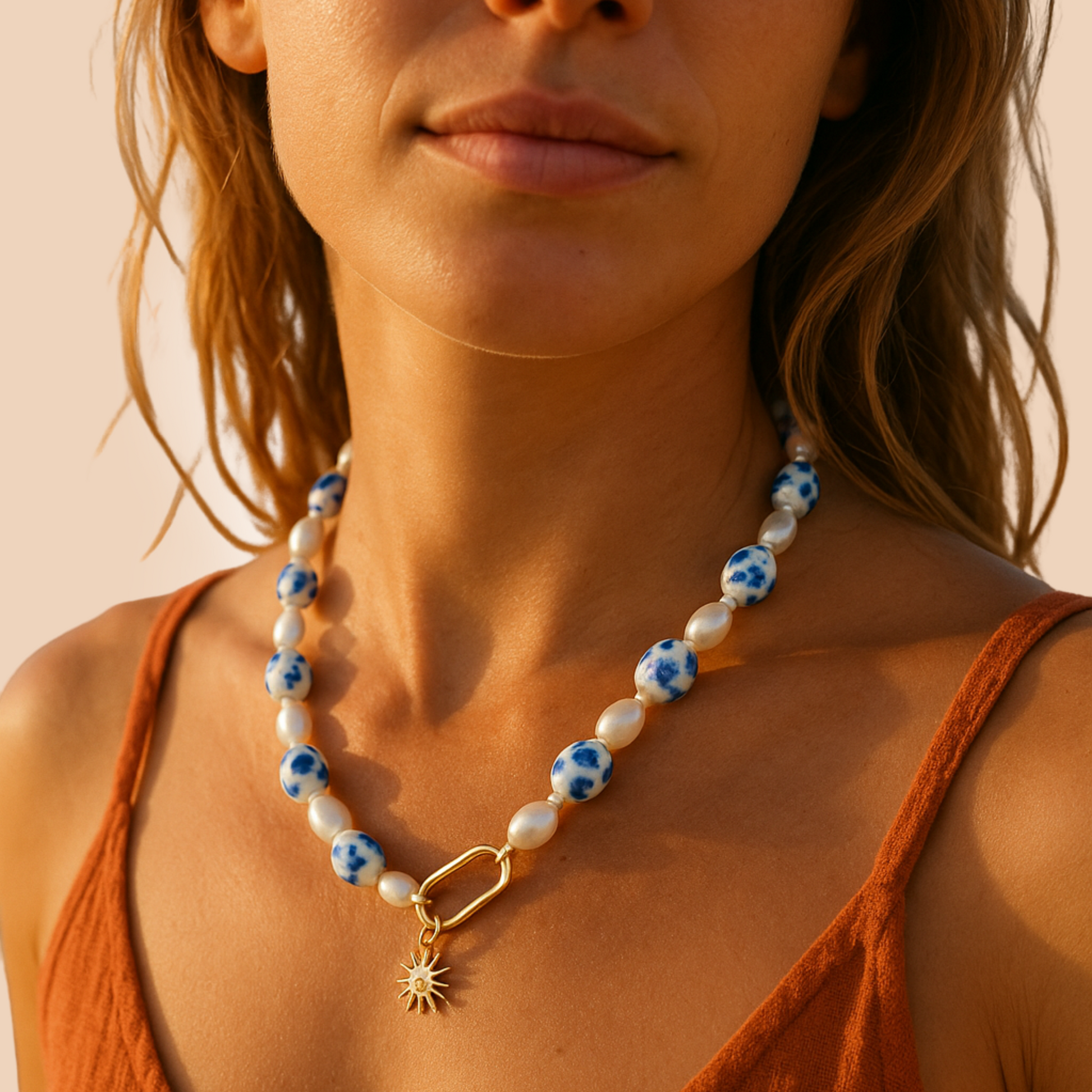 Brisa salada, sol en la piel y esa confianza que te hace caminar más liviana. Un mood de verano permanente. El Collar Rodas está confeccionado con cuentas de arcilla polimérica hechas y pintadas a mano con perlas naturales de río y cierre de acero quirúrgico.