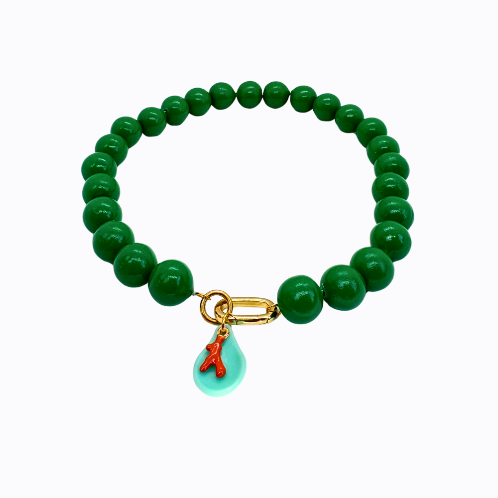El Collar Color Pop Verde es un statement simple y chic: cuentas verdes hechas a mano una a una, con un colgante/charm desmontable de un pétalo turquesa y un coral de color naranjo. Se ve increíble con blanco, negro, denim o lino — y levanta cualquier look en segundos.